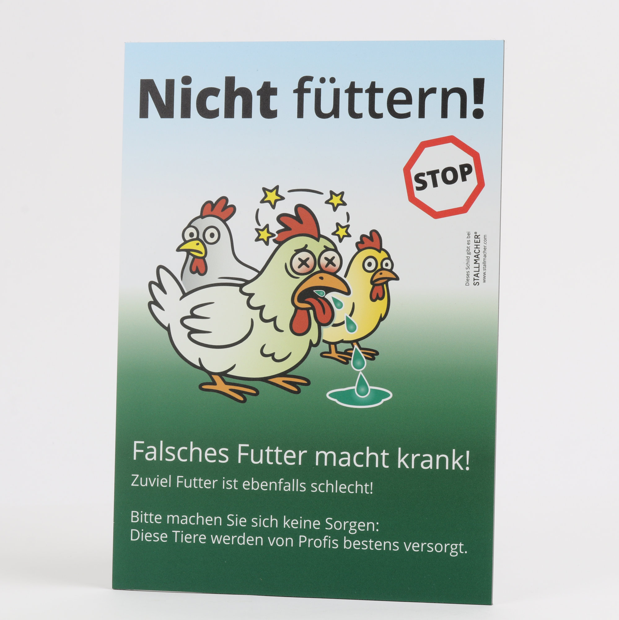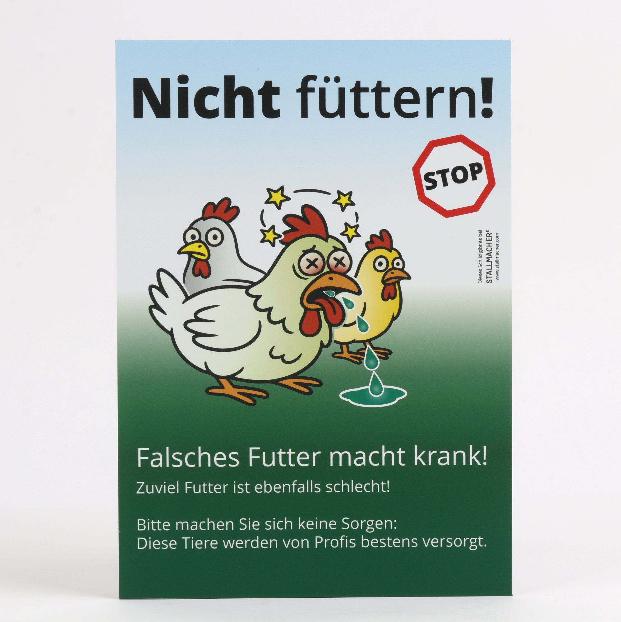 - Motiv „Nicht füttern!“ mit zwei besorgten und einer kranken Henne